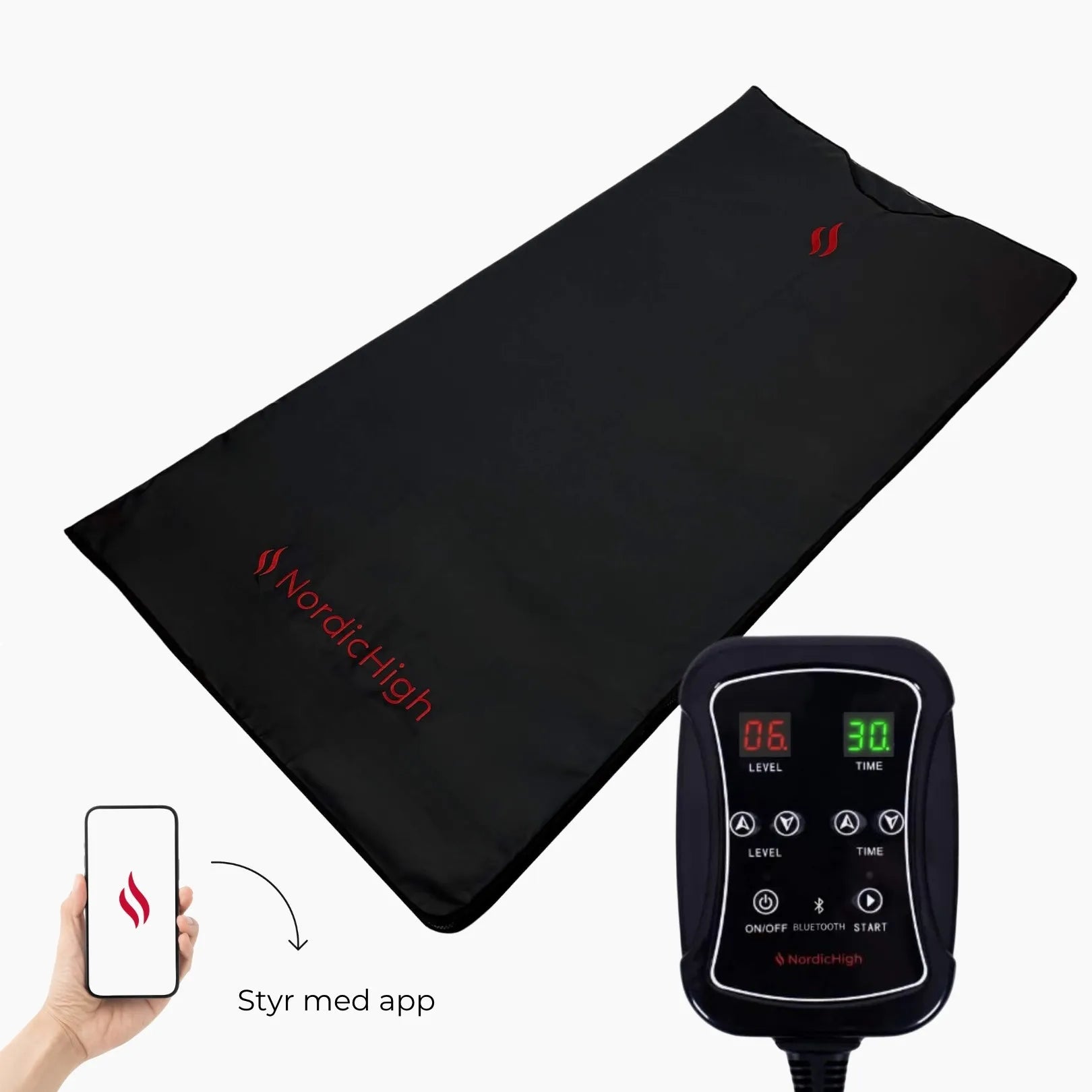 Et infrarødt saunateppe – også kjent som et infrarødt varmeteppe – varmer kroppen innenfra ved hjelp av infrarøde stråler (FIR), i motsetning til en tradisjonell badstue som varmer opp luften rundt kroppen. Denne teknologien gir en mild og behagelig varmeopplevelse, og gjør saunateppet ideelt for deg som ønsker de samme helsefordelene som en badstue, men i et mer tilgjengelig og avslappet format hjemme.
